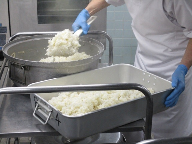 写真は、ドライカレーの調理風景、ご飯の配缶の様子です。