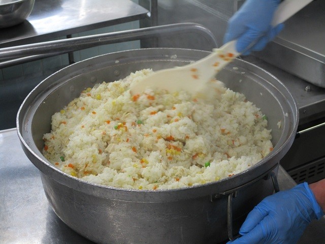 写真は、チキンカレーの調理風景、ご飯の配缶の様子です。