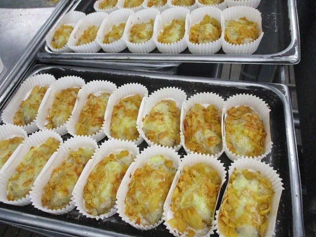 身の締まっためばるに、コーンフレークとチーズをのせて焼き上げた一品。表面はサクッと香ばしく、にんにくやしょうゆの風味がアクセントになっていました。