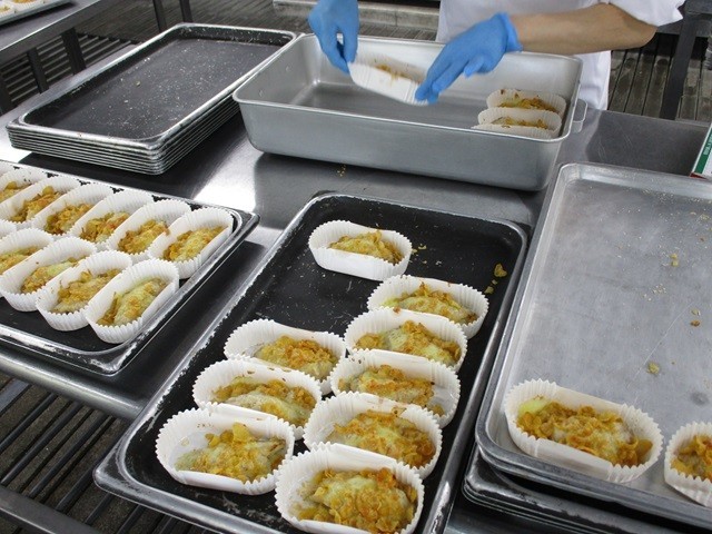 写真は、ホワイトソースの調理風景、パプリカライスの配缶の様子です。