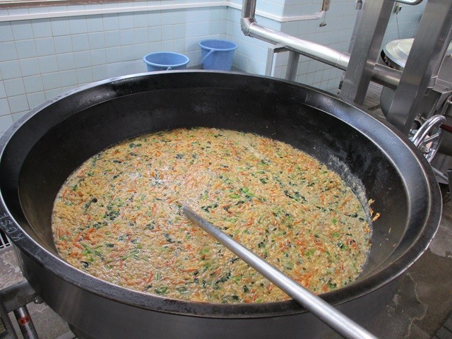 写真は、ふかの配缶の様子、かぶ入りポトフの調理風景です。