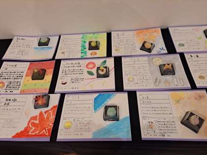 今日掲載した写真は、9年生の書き初め、7年生の美術の「そっくりにつくる」、8年生の美術「季節を伝える和菓子」の展示です。