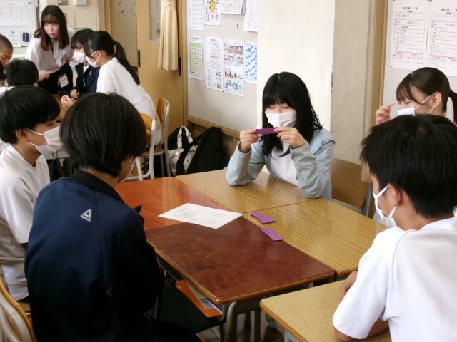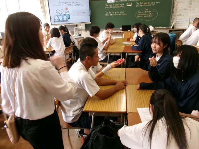 意味や用法の説明の後は、実際に班のメンバーに「~しなければならない」と英語で指示を出す活動、つまり「王様ゲーム」に突入です。メンバーの一人がカードを引き、英文の意味を確認しながら指示を出していきます。