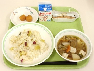 さつまいもごはん 鮭の塩焼き けんちん汁 おつきみだんご 牛乳