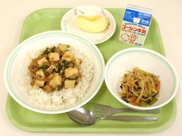 麻婆豆腐丼 切り干し大根のナムル りんご 牛乳