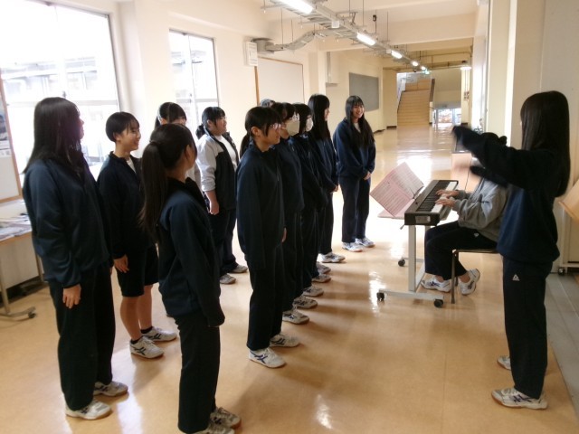 そして集大成を見せる3年生。職員室で仕事をしている私には、9年1組の「モルダウ」の男性パートが常に聞こえてくるのですが、「H先生に金賞を取らせるんだ!」という熱い思いが圧倒的な迫力をもって響いて来ております。これは1組が金賞か!?と思いながら2階9年生フロアに上がってみると、おっとどっこい!2組の男子も、もの凄いエネルギーを廊下に響かせ歌っておりました!そして、その先には3組の女子や4組と5組の男子が、これまたラジカセの音源を消し去るほどの大きな声をあげ、気合いの入った練習を展開しています。さらに6組の教室に入ると、音楽科のK先生が、生徒に勝るとも劣らぬ熱を込めて指導しておりました。