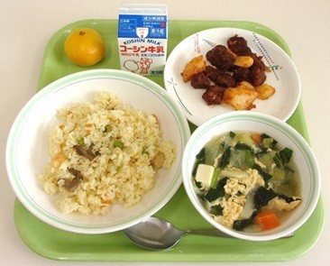 えびピラフ ポテトとレバーのマリアナソース 小松菜と卵のスープ みかん 牛乳