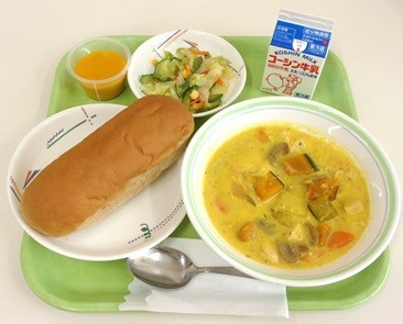 人参・玉葱・南瓜【北海道】 にんにく【青森県】 キャベツ・胡瓜【群馬県】 セロリー【長野県】 鶏肉【宮崎県】 冷凍さやいんげん【国産】 マッシュルーム水煮【インドネシア】 レンズ豆【アメリカ】 コーン缶【タイ】 コッペパン【アメリカ・カナダ】