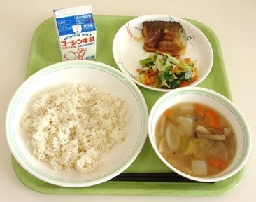 麦ご飯 さばの味噌煮 のっぺい汁 キャベツの甘酢あえ 牛乳