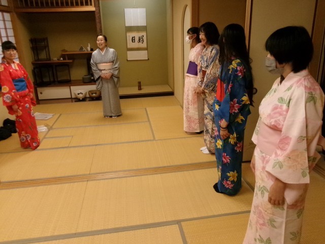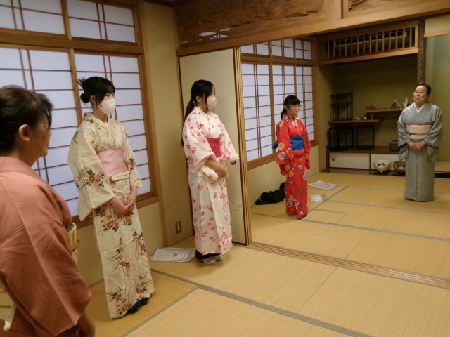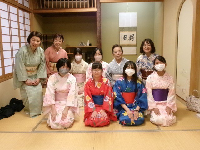 本日、家庭科部のみなさんは、装道礼法きもの学院 曽根田きもの教室(文化庁推薦)から講師の曽根田富實子先生をお招きし、ゆかたの着想と帯結びについての講習を受けました。放課後少し拝見しに伺うと、お辞儀や座り方、立ち方等の振る舞いについて教えて頂いていました。初めて着た人もいて「楽しかった」との感想を述べていました。ゆかたの色も華やかで茶道室だけ夏にリープした感じでした。最後は全員で記念撮影です!はいチーズ!