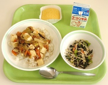 四川豆腐丼 鉄骨ごまサラダ マーラーカオ 牛乳