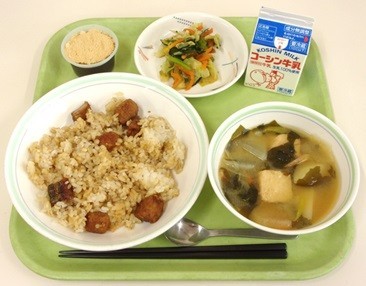 かつおごはん わかめの味噌汁 小松菜のおかかあえ 黒糖寒天 牛乳