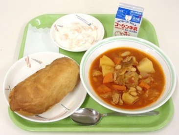 じゃが芋・玉葱【北海道】 鶏卵・にんにく【青森県】 人参【千葉県】 鶏肉【山梨県】 セロリー【静岡県】 キャベツ【愛知県】 大豆・ヨーグルト【国産】 コッペパン【小麦:アメリカ・カナダ】 アーモンドパウダー【アメリカ】 トマト缶【イタリア】 黄桃缶【ギリシャ】