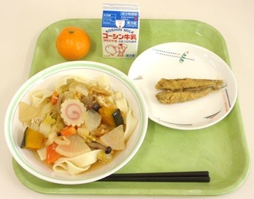 かぼちゃ入りほうとう にぎすのスパイシー揚げ みかん 牛乳