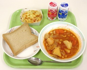 この献立のポイントは、「クリスマスなので赤色を使うようにしました。トマトスープには野菜をたくさん使いました。グラタンで2群、3群を使うようにしたので、栄養もしっかりとれます。」とのことです。