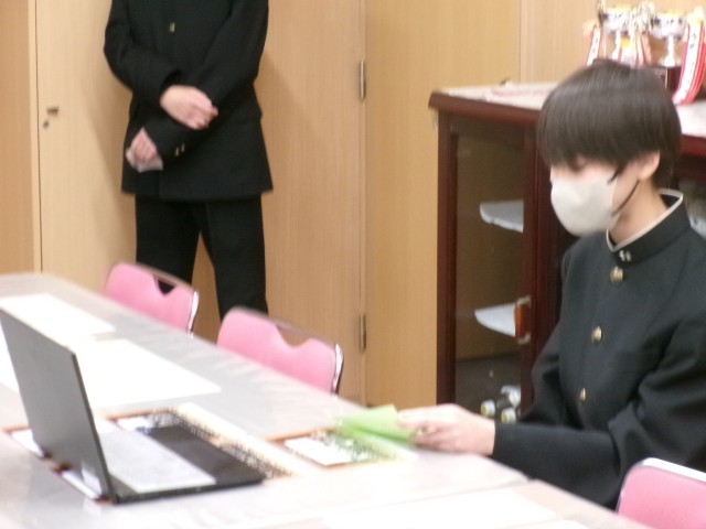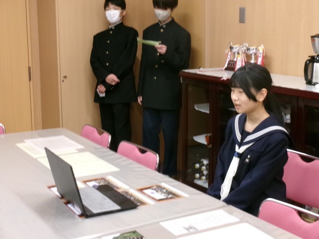 本日は生徒会朝礼ということで、生徒会執行部のみなさんや保健委員会、生活委員会の発表者が校長室に集合し、Meetによる配信を行いました。