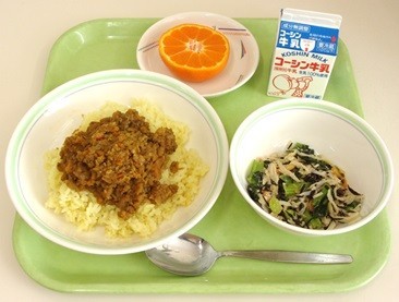 レンズ豆入りドライカレー 鉄骨ごまサラダ 花みかん 牛乳