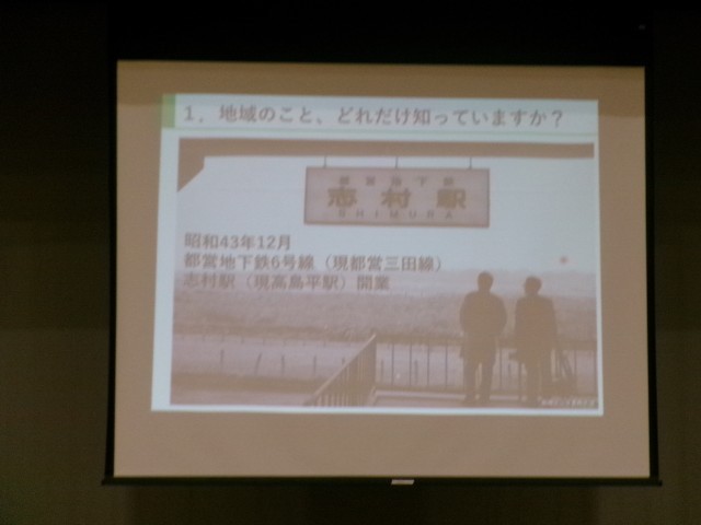 岸さんからは、高島平の歴史の説明や町会の活動についての紹介がありました。餅つき大会やラジオ体操など、生徒のみなさんもボランティアとして参加していますね。