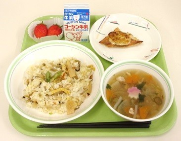進級のお祝いとして、今日は主食を「春のちらし寿司」にしました。具材のタケノコは旬の野菜です。また、ごはんに「きび」を加え、黄色い菜の花や春のあたたかさを感じられるようにしています。舌でも目でも、春を感じてください。