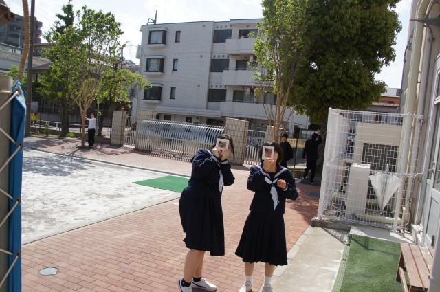 校長室の窓からデスケル(計測器具)を片手に生徒が活動している姿が見えました。