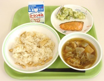 たけのこご飯 鮭のムニエル けんちん汁 若草ポテト 牛乳