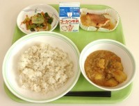 1学期最後の給食は、夏野菜カレー。夏野菜の「なす」「トマト」「かぼちゃ」などが入っています。なすと完熟トマトは成増の農家、染宮さんの畑で採れたものです。