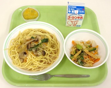 給食では、ぶなしめじを「和風スープスパゲティー」に入れました。この和風ソースには、ぶなしめじの他、エリンギも入っています。きのこの食感や香りを楽しんで食べてください。