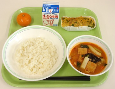 ご飯 中華風卵焼き キムチ味噌スープ 冷凍みかん 牛乳