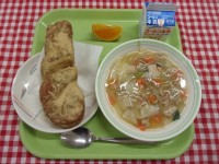 3月4日(水)今日のメニューは、きな粉揚げパン、ワンタンスープ、デコポン、牛乳で...