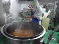 そぼろ作り:鶏そぼろ: 鶏ひき肉を炒め、醤油、みりん、砂糖、酒で味付けをして汁気がなくなるまで煮詰める。