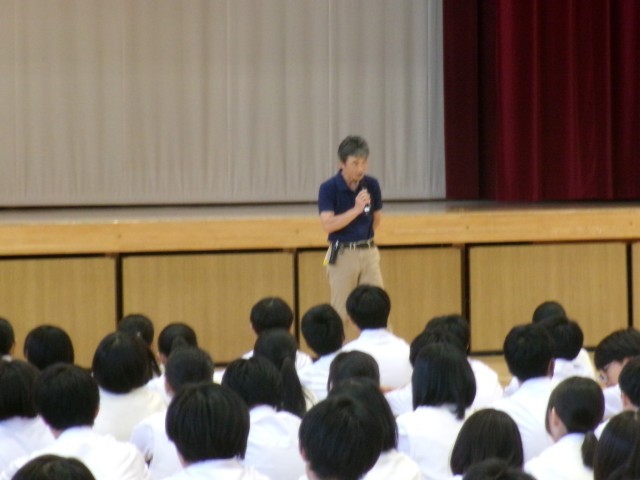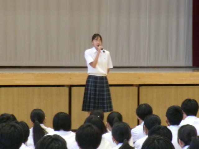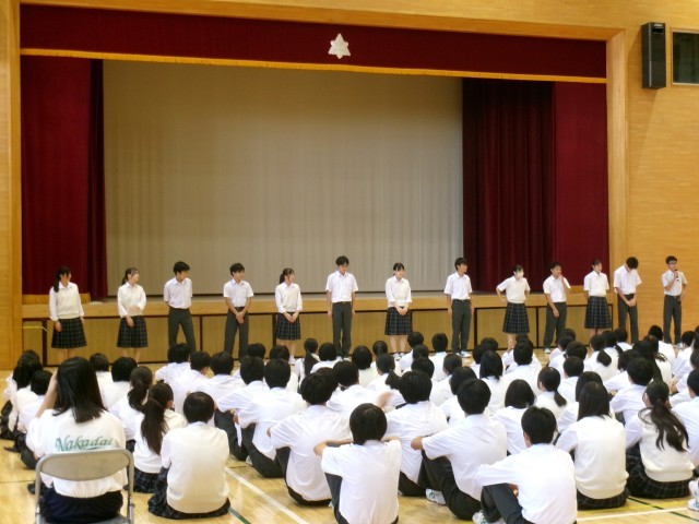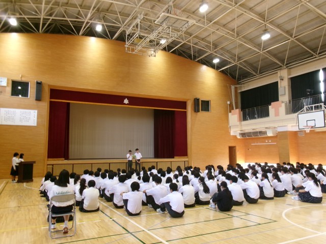 前半は、体育館に集い、修学旅行のふりかえりアンケートの