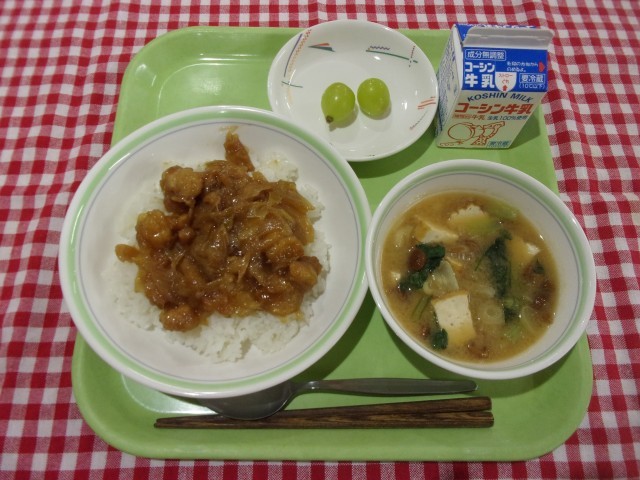 今日のメニューは、鶏ねぎ丼、なめこの味噌汁、シャインマスカット、牛乳です。