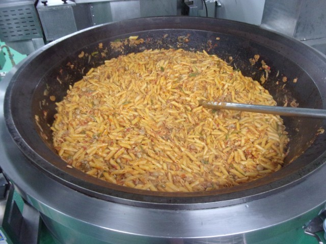 今日のメニューは、ペンネアラビアータ、イタリアンドレッシングサラダ、ブルーベリーマフィン、牛乳です。