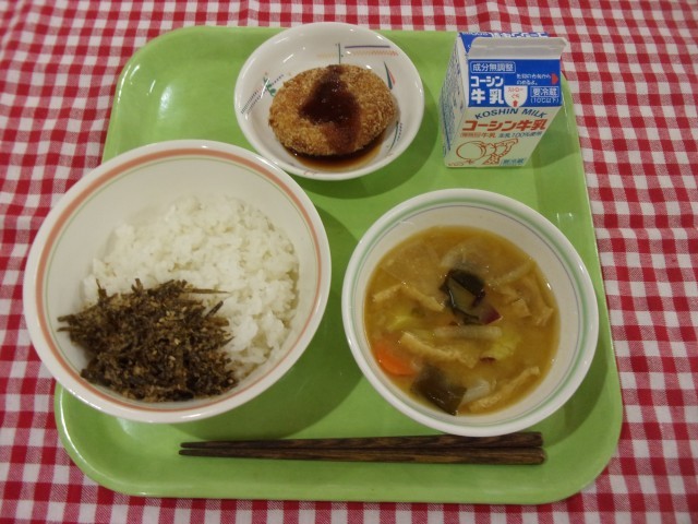 今日のメニューは、ご飯、エコふりかけ、おからコロッケ、丸ごと野菜の味噌汁、牛乳です。