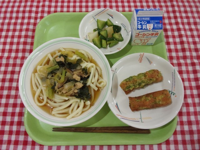 今日のメニューは、鴨南蛮風うどん、竹輪の磯辺揚げ、胡瓜と大根のピリ辛漬け、牛乳です。