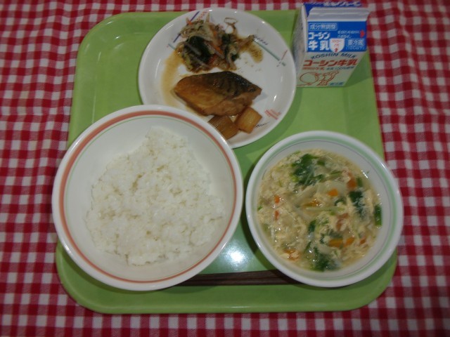今日のメニューは、ご飯、さばのみそ煮、磯香和え、かんぴょうの卵とじ汁、牛乳です。