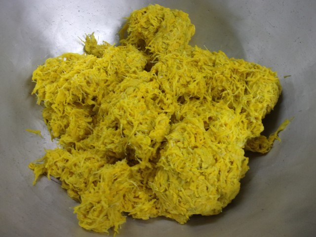 肉だねを一口大に丸め、細切りにした皮を周りにしっかりとまぶしつけます。