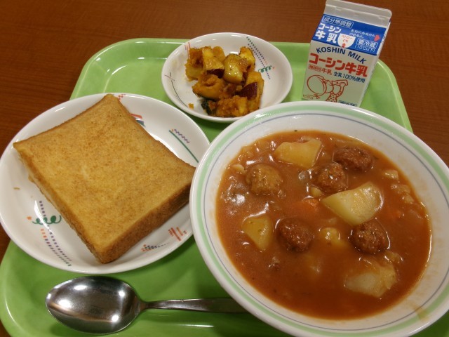 今日のメニューは、きなこ豆乳トースト、ミートボールのトマト煮、かぼちゃのサイコロ揚げ、牛乳です。