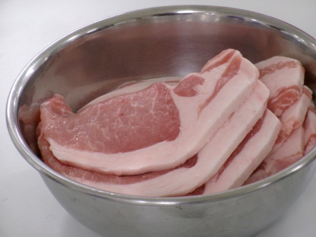 豚肉の準備豚肉は調理の10分前に冷蔵庫から出し、常温に近づけておくと火の通りが均一になります。