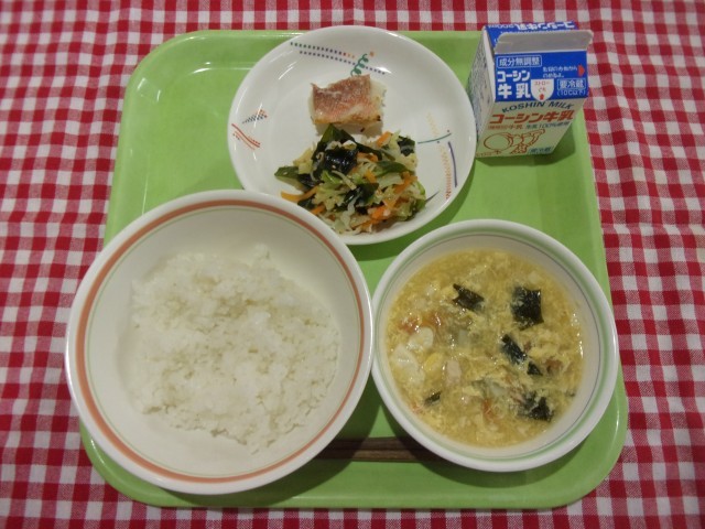 今日のメニューは、ご飯、赤魚の塩麹焼き、切り干し大根の和え物、むらくも汁、牛乳です。