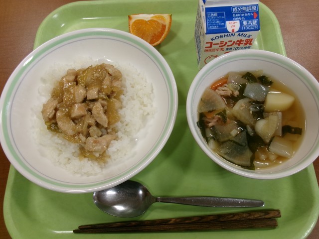 今日のメニューは、鶏肉の塩麹漬け丼、田舎汁、みはや、牛乳です。
