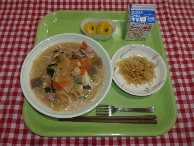 今日のメニューは、冬至うどん、大根ともやしのピリカラ、かぼちゃ団子、牛乳です。