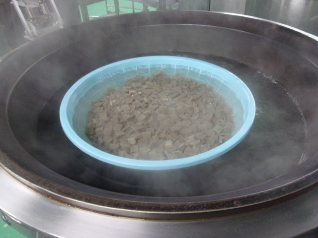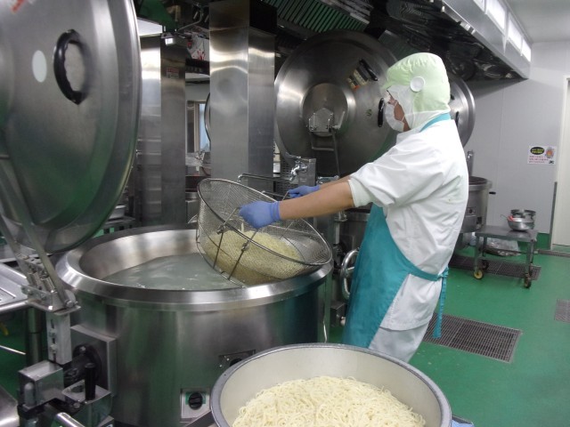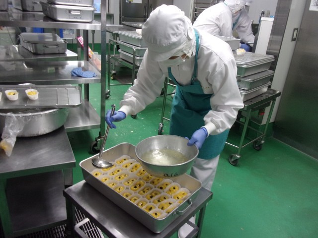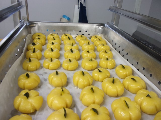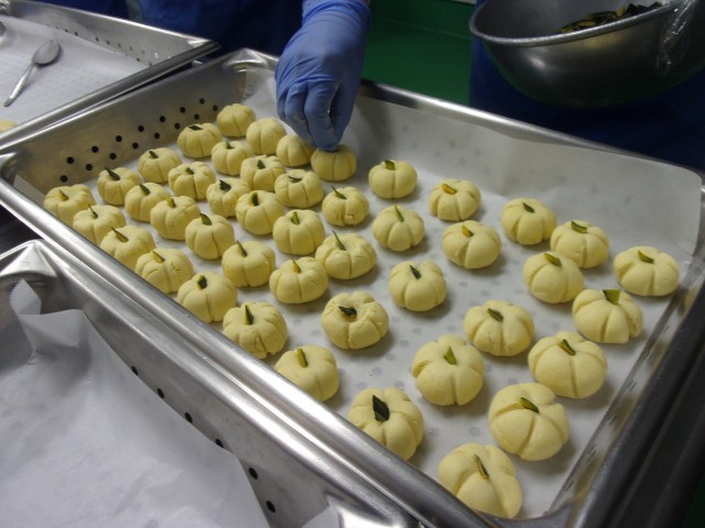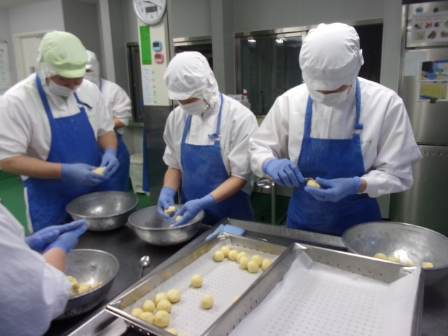 今日は、かぼちゃ団子をひとつひとつ丁寧に給食室のみなさんが