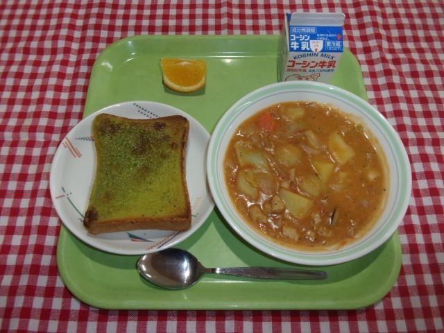今日のメニューは、抹茶ミルクトースト、トマトシチュー、いよかん、牛乳です。