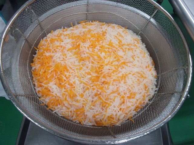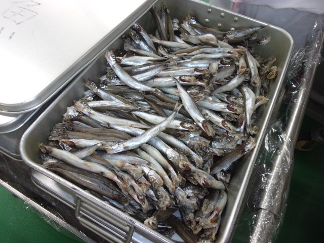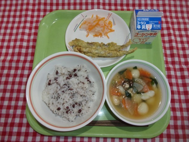 今日のメニューは、小豆飯、ししゃもの磯辺揚げ、紅白なます、白玉雑煮、牛乳です。