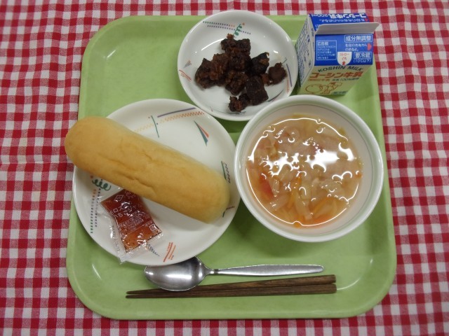 今日のメニューは、コッペパン、いちごジャム、くじらのかりん揚げ、野菜スープ、牛乳です。