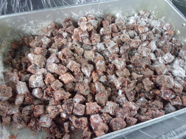 くじらの竜田揚げ: 生姜醤油で下味をつけ、片栗粉をまぶして揚げたもの。