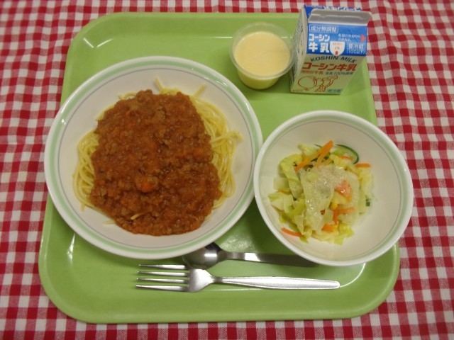 今日のメニューは、ミートソース、フレンチサラダ、カスタードプリン、牛乳です。