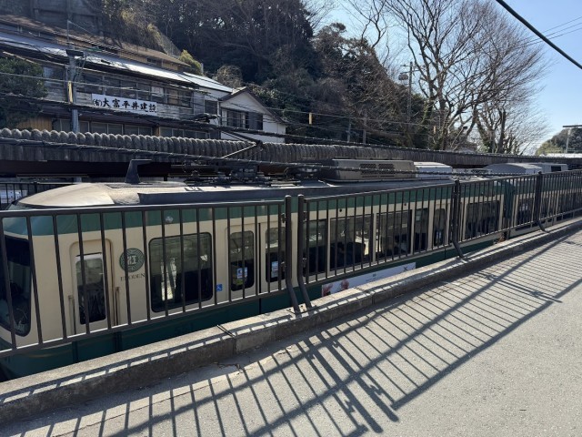 路面電車区間: 腰越駅付近では、電車が普通の道路を車と一緒に走ります。