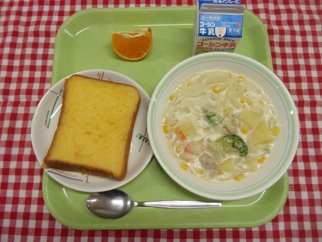 今日のメニューは、フレンチトースト、クリームシチュー、甘平、牛乳です。